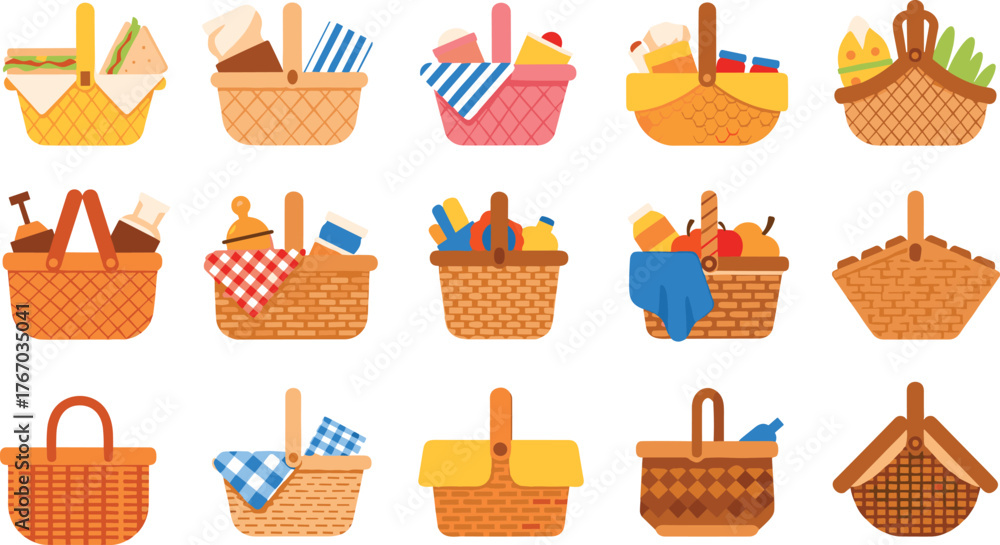 • Collection of picnic baskets, woven designs with food, fruits, bread, drinks, outdoor meal setup, summer picnic illustration, decorative vector art