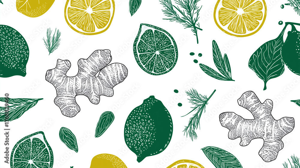 • Seamless minimal lineart design with herbal teas lemon lime ginger mint dill and leaves creating fresh and natural botanical pattern for kitchen or tea packaging