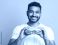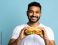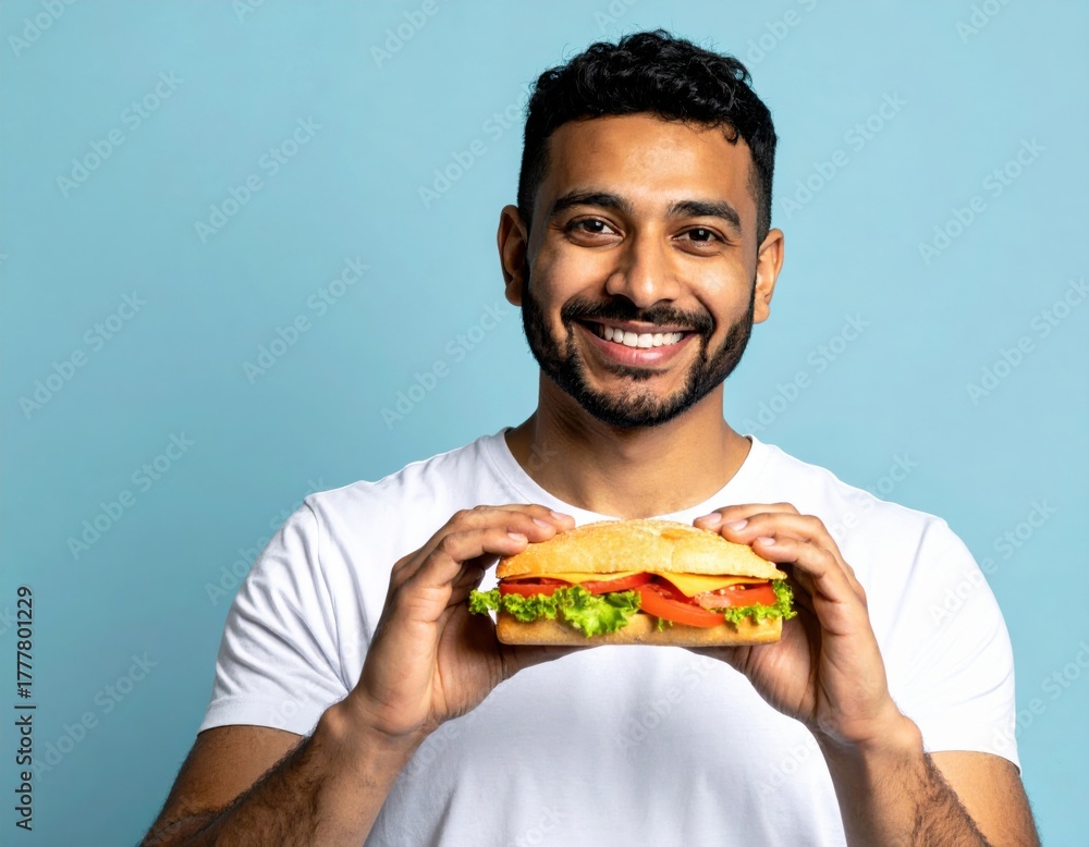• A smiling, handsome man in a white t-shirt holds a freshly made sandwich, which is presented against a plain, muted blue studio background.