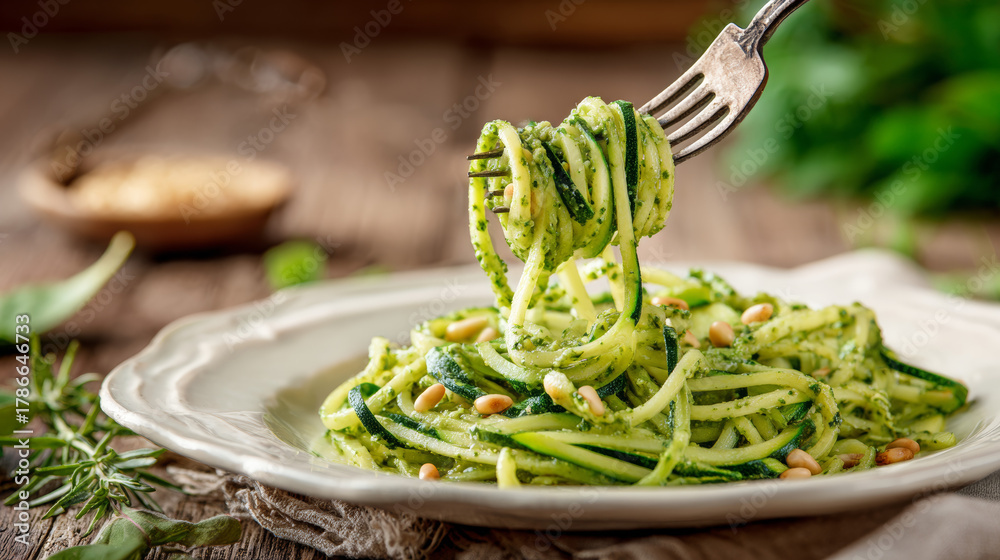 Fototapeta do Restauracji - Zucchini pesto noodles with pine nuts on fork #1786646733