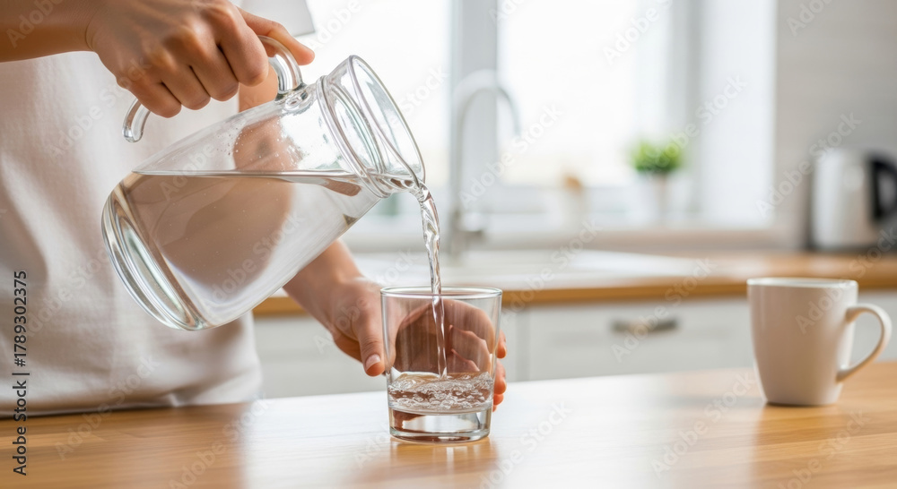 • Person pouring clean water from glass pitcher into drinking glass on kitchen counter promoting easy access to hydration and calm everyday moment