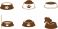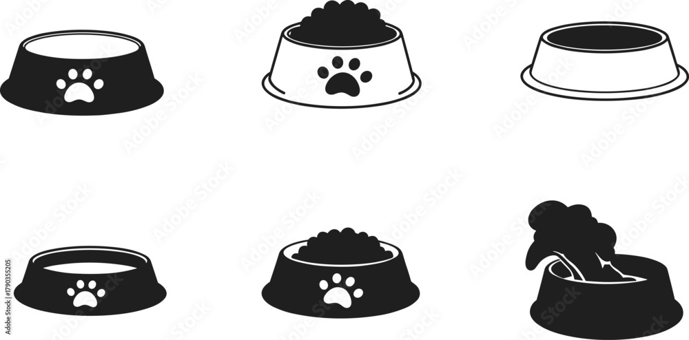 • Pet food bowls vector set, dog and cat feeding dishes, animal meal containers, kibble icons, isolated black and white illustration