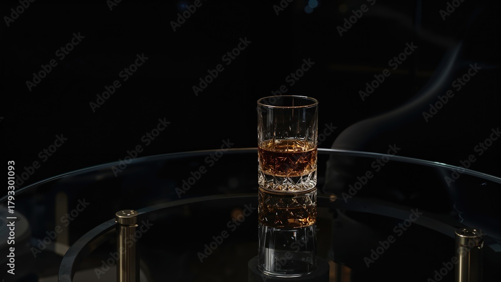 Fototapeta do Restauracji - A glass of whiskey on a reflective table surface with a dark background. #1793301093