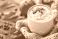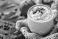 • Warm pumpkin spice latte with whipped cream, cocoa, and coffee beans, resting on a cozy knitted blanket with fall leaves