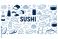 • Black and white sushi ingredients and dishes illustration with fish, rice, and sauce bottles