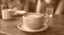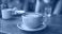 • A colorful ceramic coffee cup with latte art sits on a wooden table in a cafe