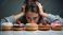 • Woman stressed over donuts, holding head. Needs comfort food but feels overwhelmed by unhealthy options. Struggles with binge eating and food choices.