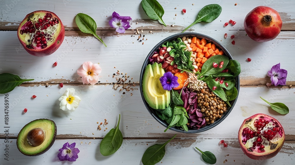 • Vibrant vegan buddha bowl ready to eat for healthy lifestyle and wellness with fresh avocado, pomegranate and edible flowers on white wood table