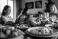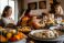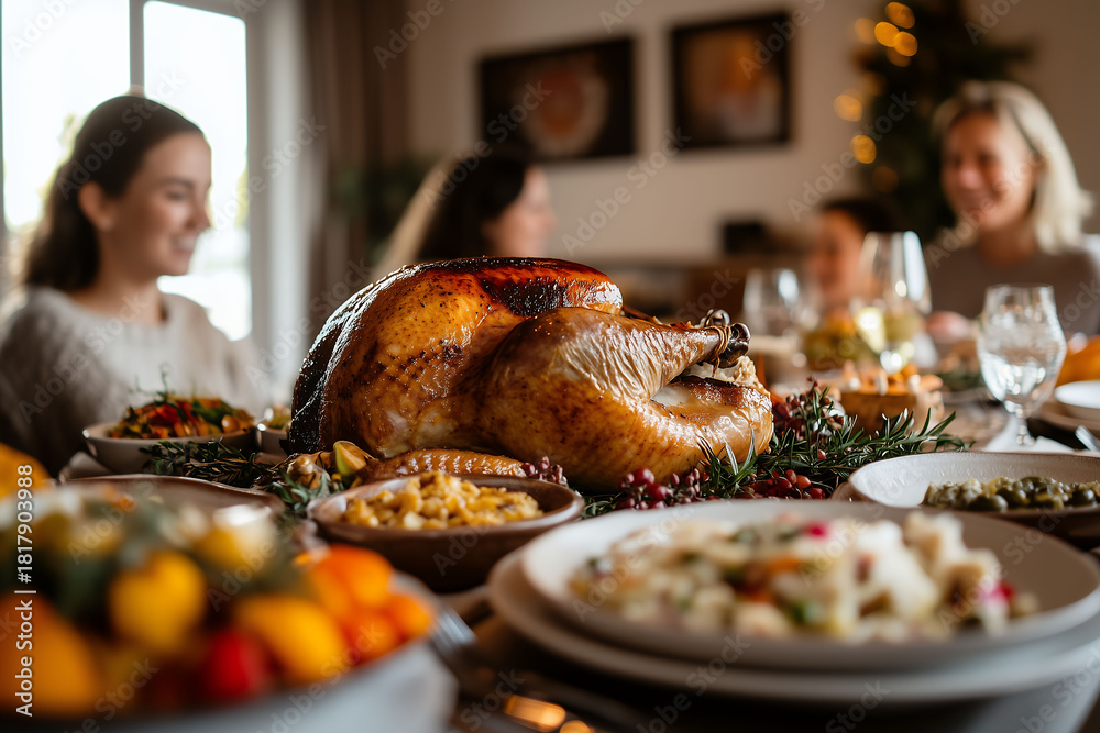 • A Roasted Turkey Dinner with Family and Friends Enjoying a Holiday Meal