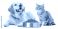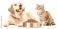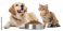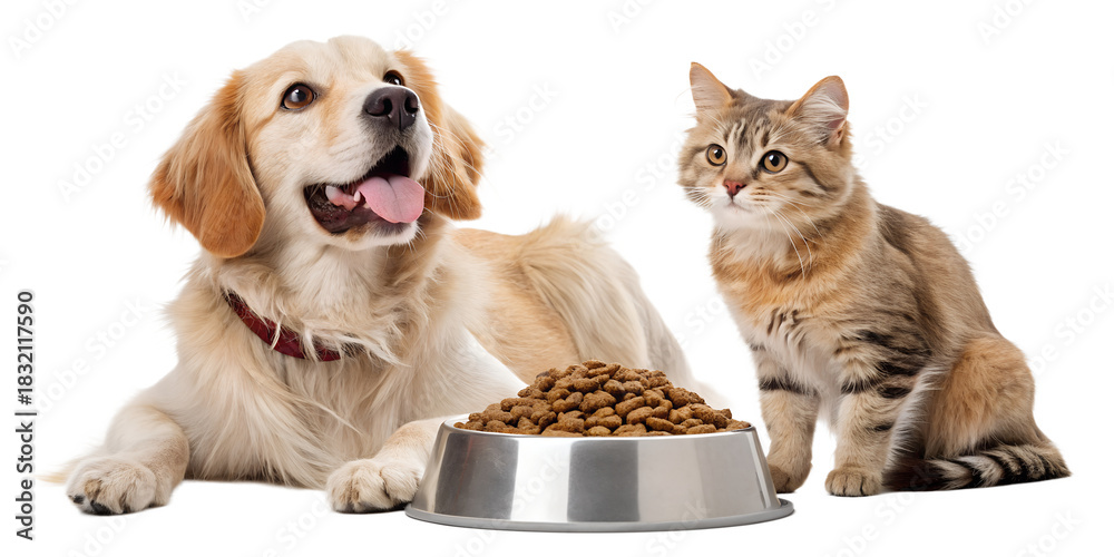 • Cute domestic pets eating dry pet food from bowls — a playful dog and an cat sit together and enjoy their meal. Realistic lighting, high-detail fur, soft shadows, commercial studio style, isolated on