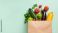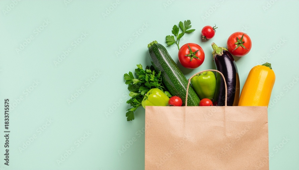 • Fresh, vibrant vegetables and organic produce spilling from an eco-friendly paper bag, perfect for healthy eating and sustainable grocery shopping