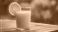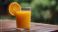 • A glass of fresh orange juice with an orange slice garnish sits on a wet wooden table outdoors during a gentle rain shower