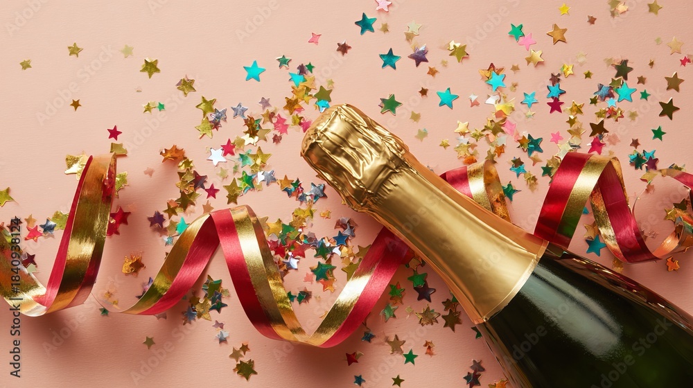 • Champagne bottle with confetti stars and colorful party ribbons for festive celebration