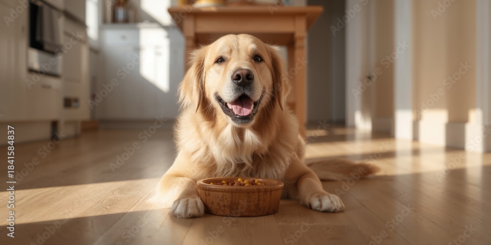 Fototapeta do Restauracji - Golden Retriever eating food, dietary habits and potential health considerations #1841584837