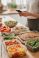 Fototapeta do Restauracji - Meal prep containers with fresh vegetables and salmon on kitchen counter woman using mobile phone... #1844372347