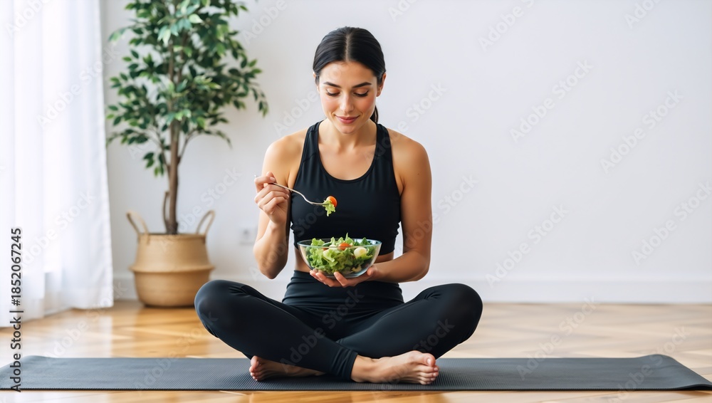 Fototapeta do Restauracji - Fit woman in sportswear eating a healthy salad after a workout. Young female sitting on a yoga... #1852067245