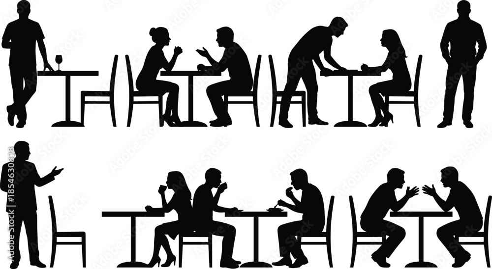 Fototapeta do Restauracji - Restaurant silhouette icons, café interaction figures, black people clipart, dining poses, social... #1854630828