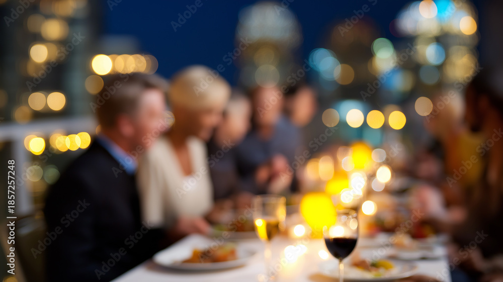 Fototapeta do Restauracji - People dine joyfully together at a rooftop table. City lights glow in the distance Generative AI #1857257248
