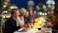 • People dine joyfully together at a rooftop table. City lights glow in the distance Generative AI