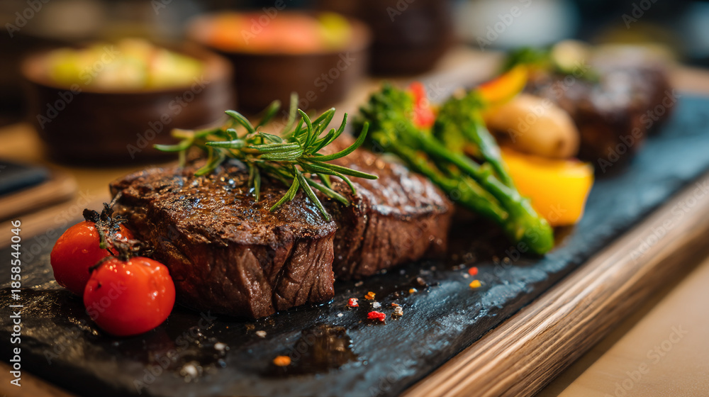 Fototapeta do Restauracji - A mouthwatering plate of grilled steak with vegetables and herbs on a black slate board #1858544046