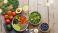 • Healthy eating A vibrant overhead view of a delicious and nutritious meal, showcasing fresh ingredients arranged on a rustic wooden table