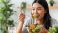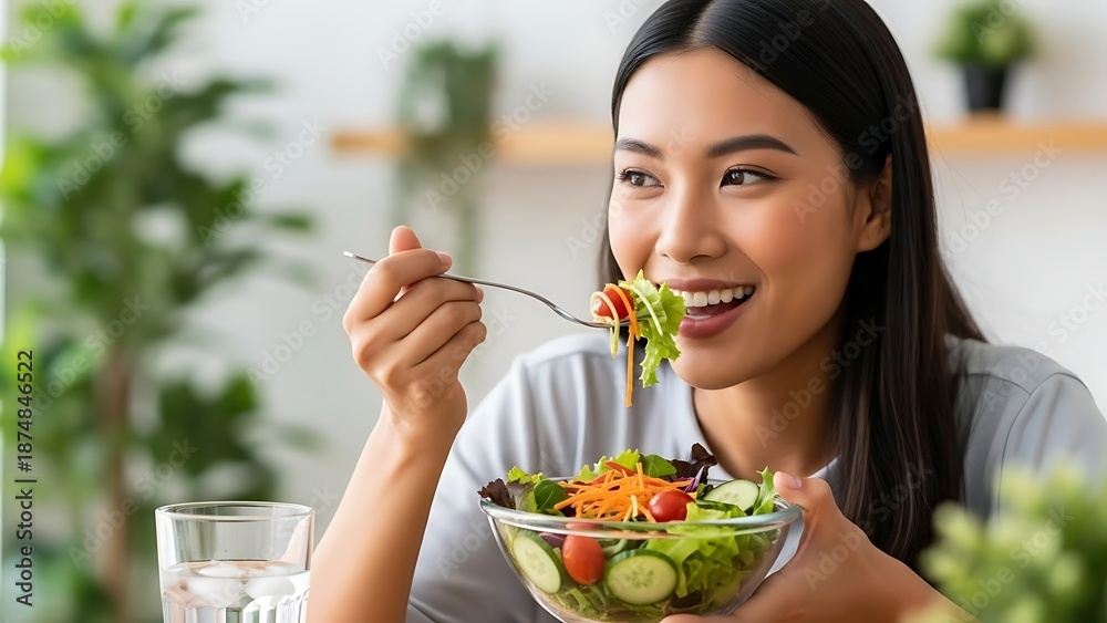 • Asian Woman Eating Healthy Salad, Smiling, Lifestyle