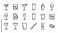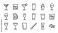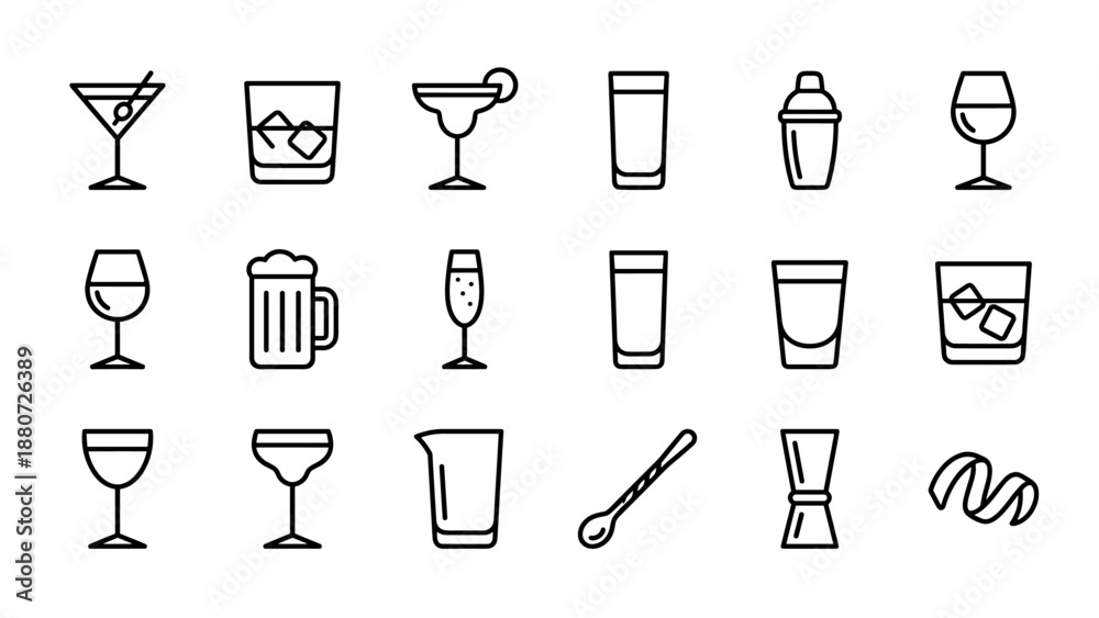 • Set of 16 cocktail and bar drink line icons. Minimalist vector style. Alcohol beverage glassware collection. Martini wine beer whiskey glass outline. Pub restaurant menu design.