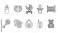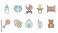 • Baby care icons. Newborn accessories collection. Cute infant items. Nursery equipment. Bottle, diaper, stroller, pacifier, crib, rattle. Baby shower elements. Parenting vector.