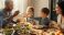 • Diverse family shares wholesome, abundant meal around a sunlit wooden table