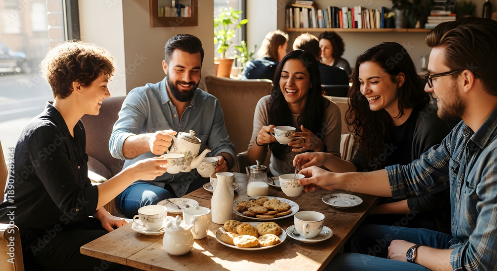 Fototapeta do Restauracji - Happy young people sitting at a wooden table talking and laughing while drinking hot beverages... #1890728264