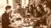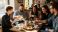 • Happy young people sitting at a wooden table talking and laughing while drinking hot beverages and eating snacks