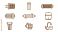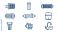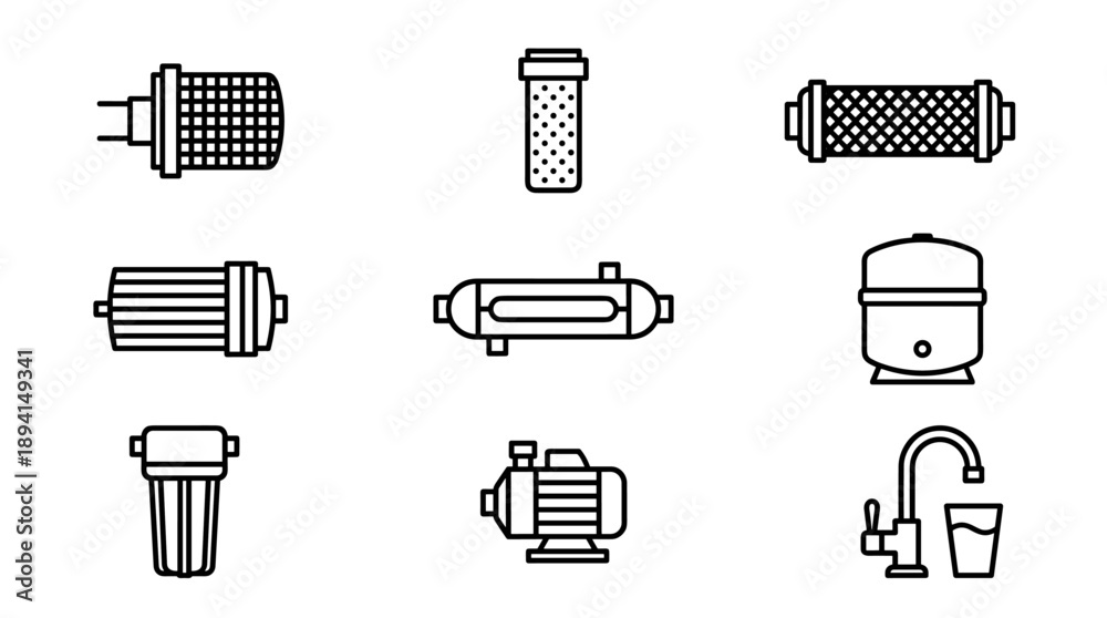 • Minimalist Line Art Vector Icon Set of Water Purification System Components. Collection Includes Reverse Osmosis Filters, Water Pump, Storage Tank, Faucet with Glass, and Membrane Housing Icons.