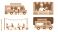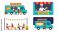 • Vibrant flat vector illustration set of a Mexican taco food truck business featuring scenes of customers queuing, a chef serving fresh tacos, people dining outdoors, and the truck at night time.