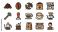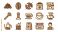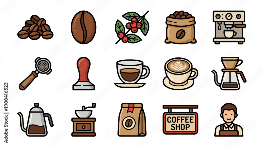 • Professional Coffee Icon Set Featuring Espresso Machine, Barista, Roasted Beans, Grinder, Tamper, and Latte Art in Bold Outline Style for Cafe Branding, Menu Design, and Web Graphics.