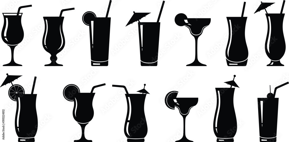 • Set of black and white cocktail glasses with straws and garnishes in drink glasses cocktail set drink set