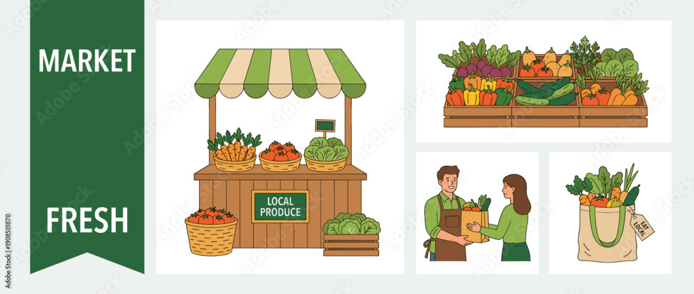 • Farmers Market Illustration Set Featuring Local Produce Stall, Fresh Organic Vegetables in Crates, Vendor Serving Customer, and Reusable Grocery Bag with Eat Local Tag for Healthy Living.