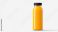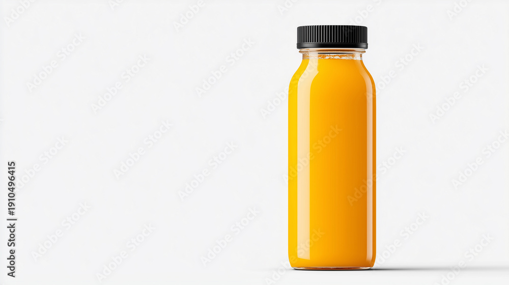 • Fresh orange juice in a clear glass bottle mockup with black cap isolated on white background.