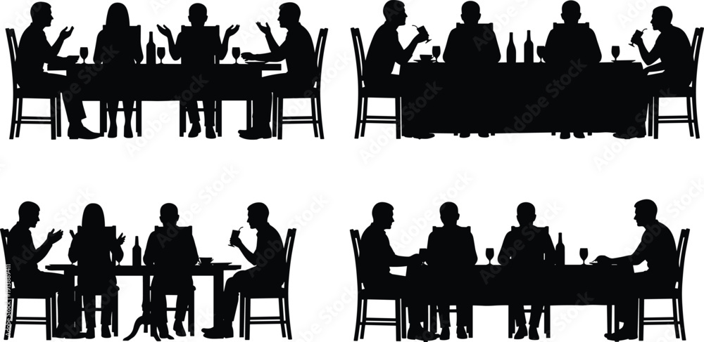 • Family dinner silhouette set with people sitting at table eating drinking wine isolated on white background vector collection