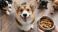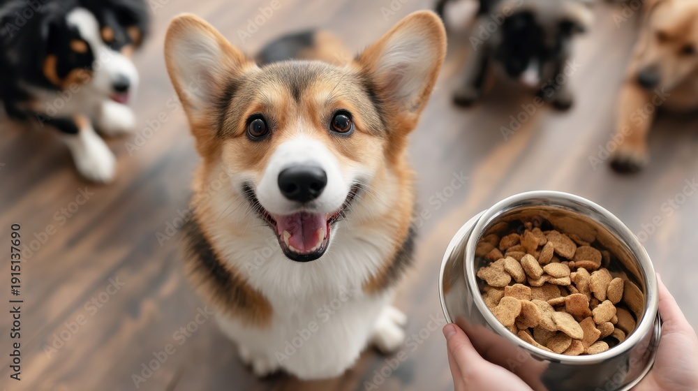 • Happy Corgi Dog Eagerly Awaiting Food with Other Dogs in the Background