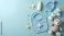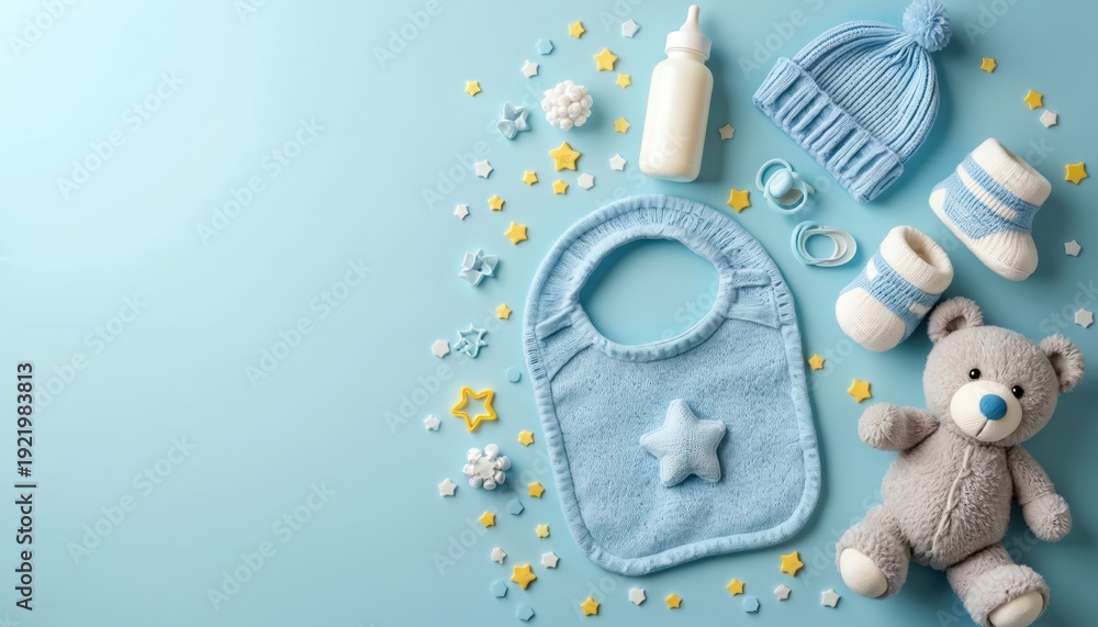 • Newborn baby boy essentials lay flat including a plush bear, bib, hat, socks, and bottle. Soft blue and white items, stars scattered around, symbolize gentle care and comfort for a little one.