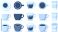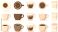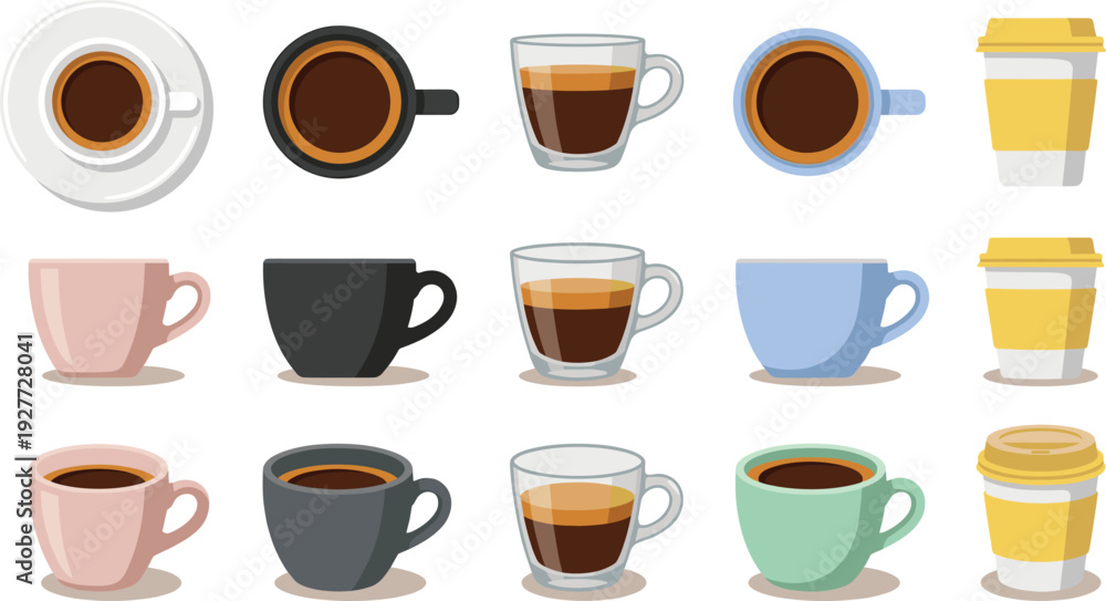 • Coffee cup set with ceramic mugs glass espresso cups and takeaway paper cups top view and side view collection for cafe menu design.
