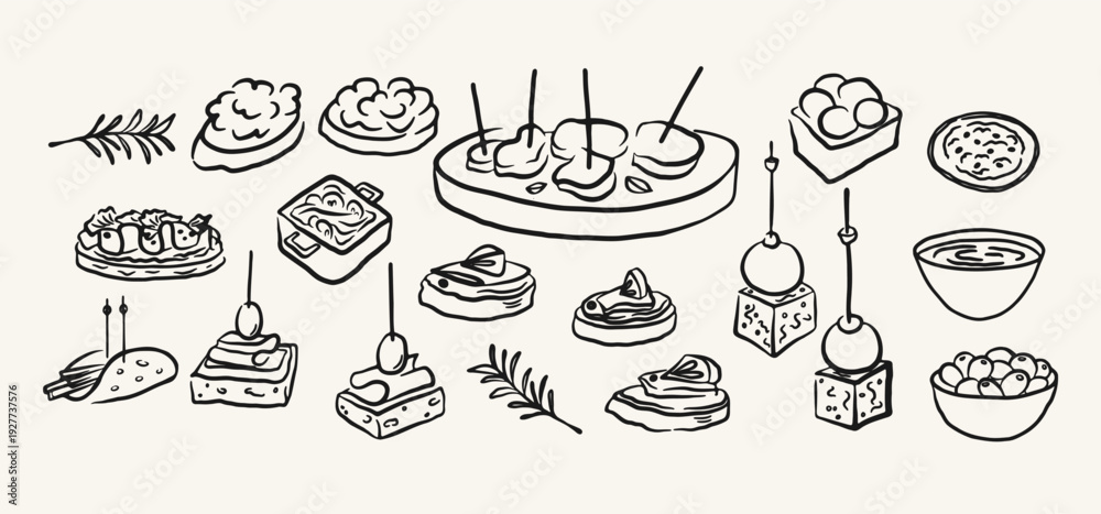 Fototapeta do Restauracji - Spanish tapas. Appetizers set. Sketch collection of traditional snacks. Hand drawn pintxos,... #1927737576