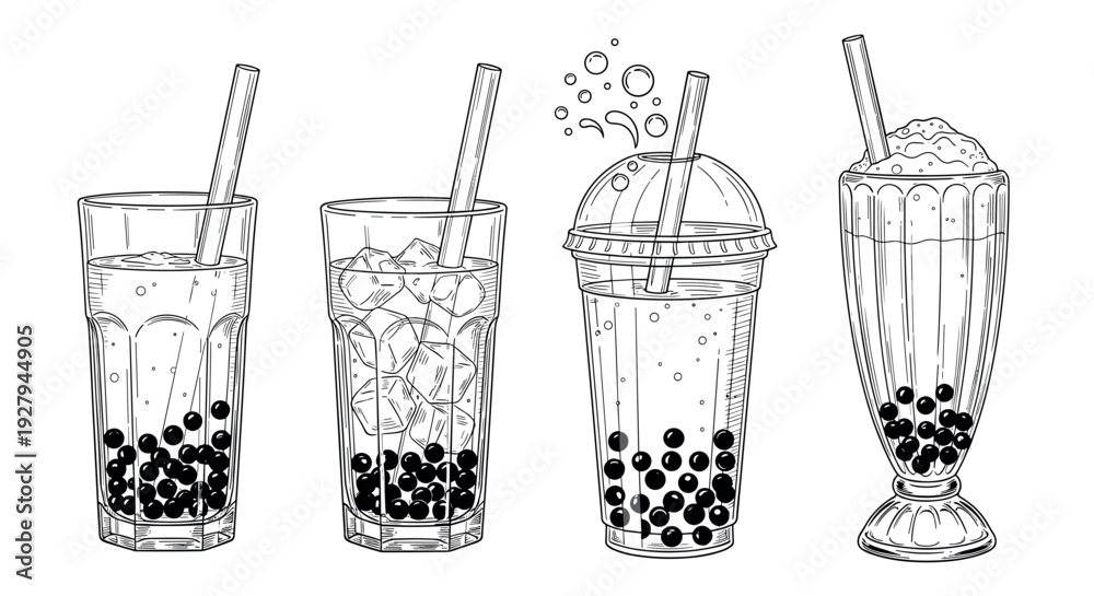 • Hand Drawn Bubble Tea Drinks Collection Black and White Vector Illustration