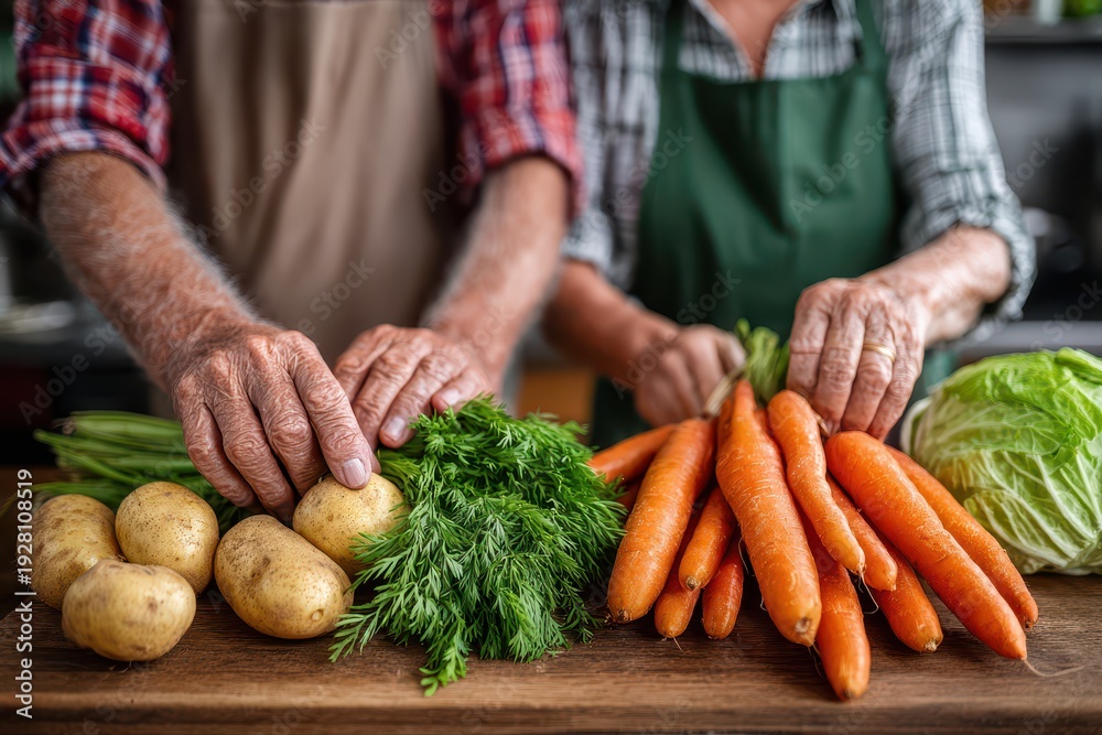 • Senior couple preparing fresh vegetables in kitchen, carrots, potatoes, dill, and cabbage, healthy eating and organic farming, rustic charm, country life simplicity.