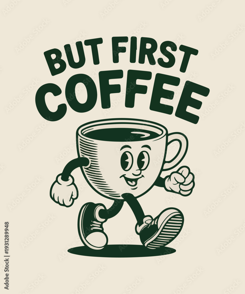Fototapeta do Restauracji - But First Coffee Funny Coffee Cup Mascot Vintage Typography T Shirt Design #1931289948