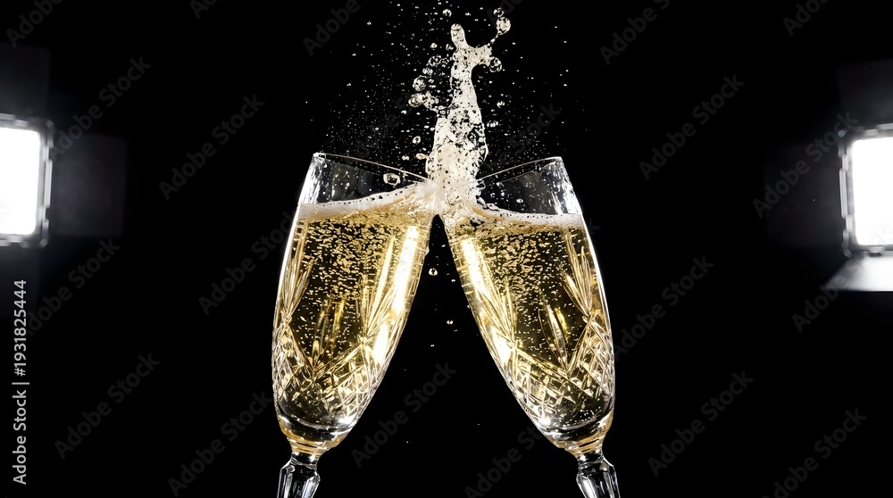 • Two crystal champagne flutes clink together resulting in an energetic, sparkling beverage splash against black