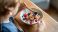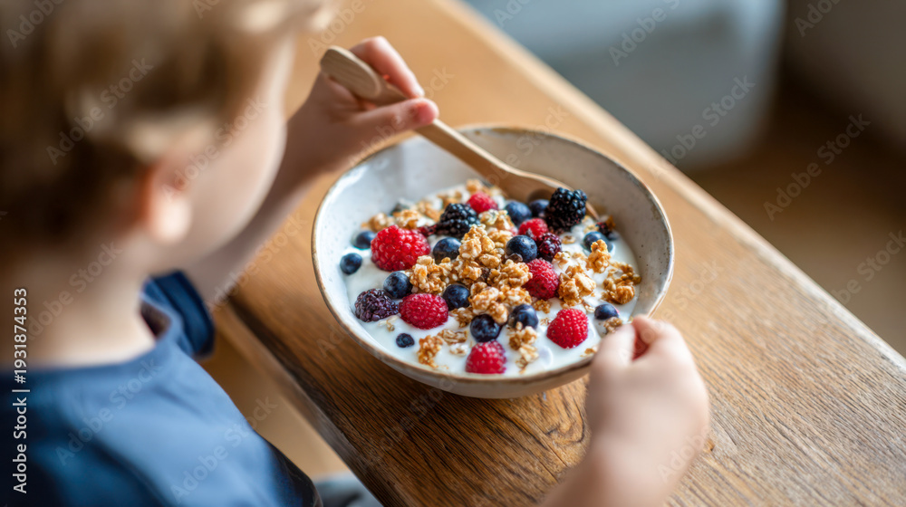 • Child holds bowl of yogurt with berries and granola at home on a sunny morning