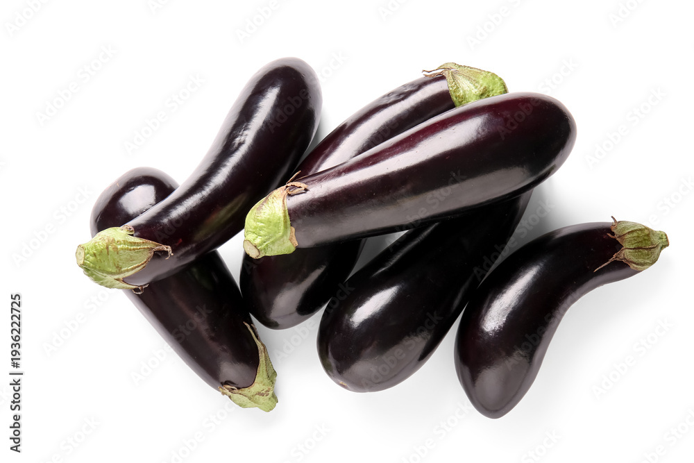 Fototapeta do Restauracji - Many fresh ripe eggplants on white background #1936222725