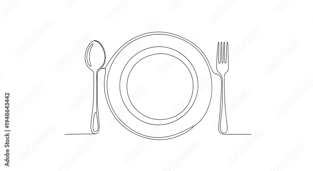 • Minimalist line art of a plate with spoon and fork, representing dining, food, and simplicity.