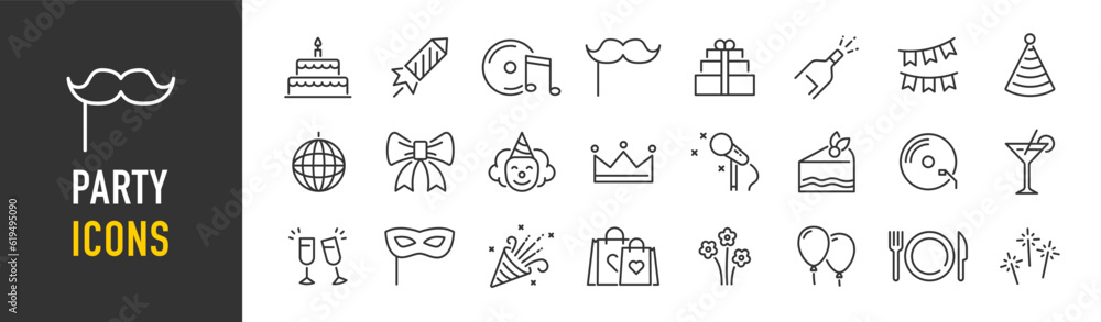 Fototapeta do Restauracji - Party web icons in line style. Birthday, dancing, happy new year, week, christmas, event,... #619495090